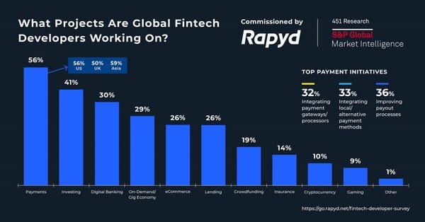 Payments, investing, and digital banking are the top initiatives being undertaken by fintech developers globally